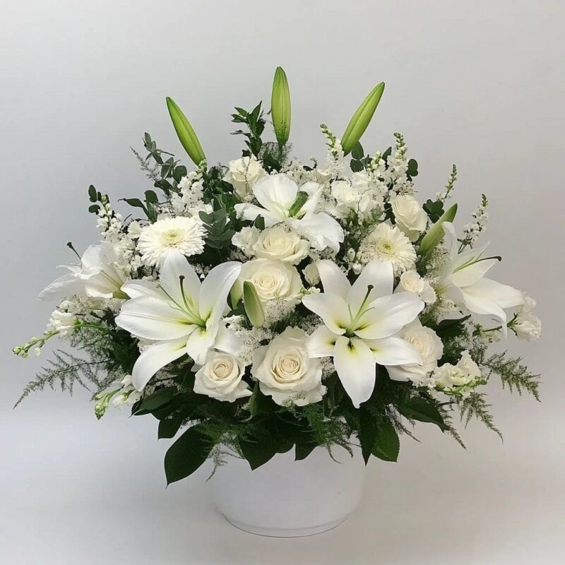 Bring a sense of peace and elegance to any setting with this white lily and rose arrangement. Featuring pristine white lilies, delicate white roses, and soft accents of lush greenery, this arrangement exudes sophistication and grace. Perfect for weddings, anniversaries, or as a thoughtful sympathy gift, itโs a timeless display of purity and tranquility.