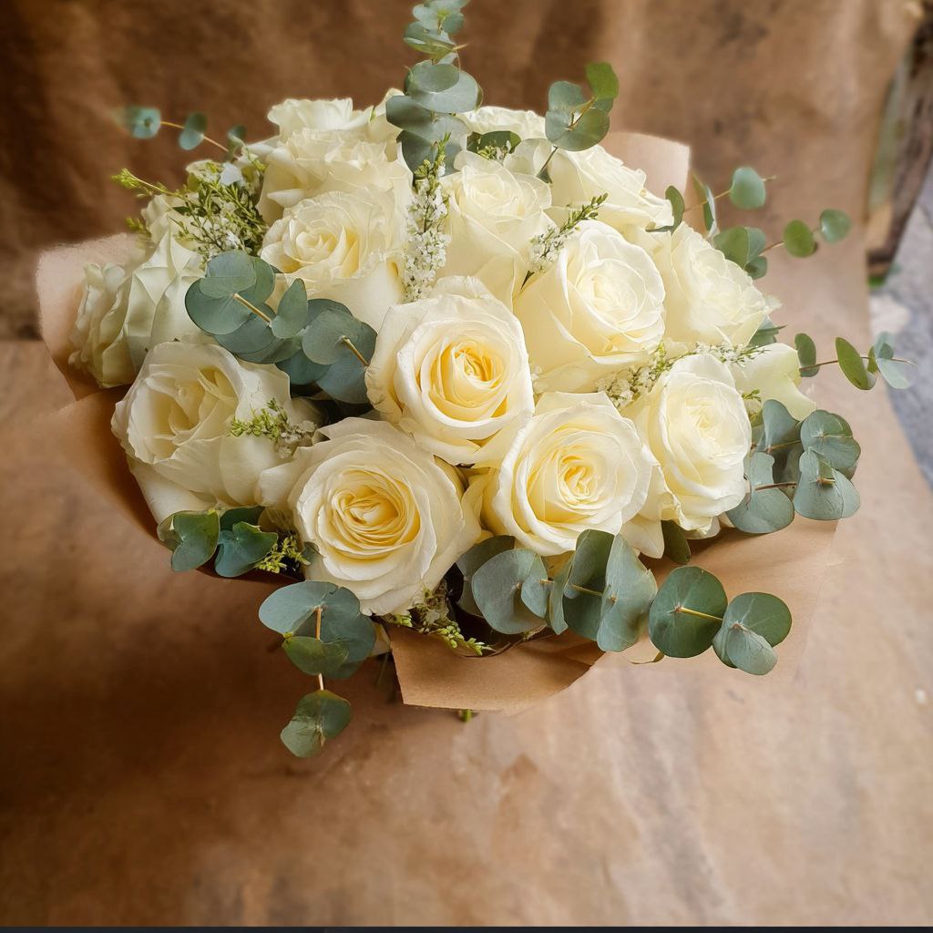 Elegant and heartfelt, our white rose bouquet with eucalyptus offers a gentle message of love and peace for lifeโs tender moments.