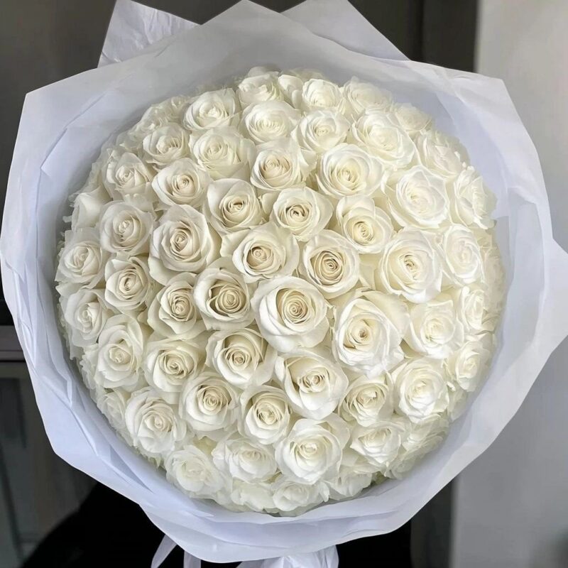 Each rose is carefully selected for its pristine petals and soft fragrance, creating a lush and full bouquet. Wrapped in elegant white paper, this arrangement exudes sophistication and charm, making it an ideal choice for weddings, anniversaries, or simply to brighten someone’s day.