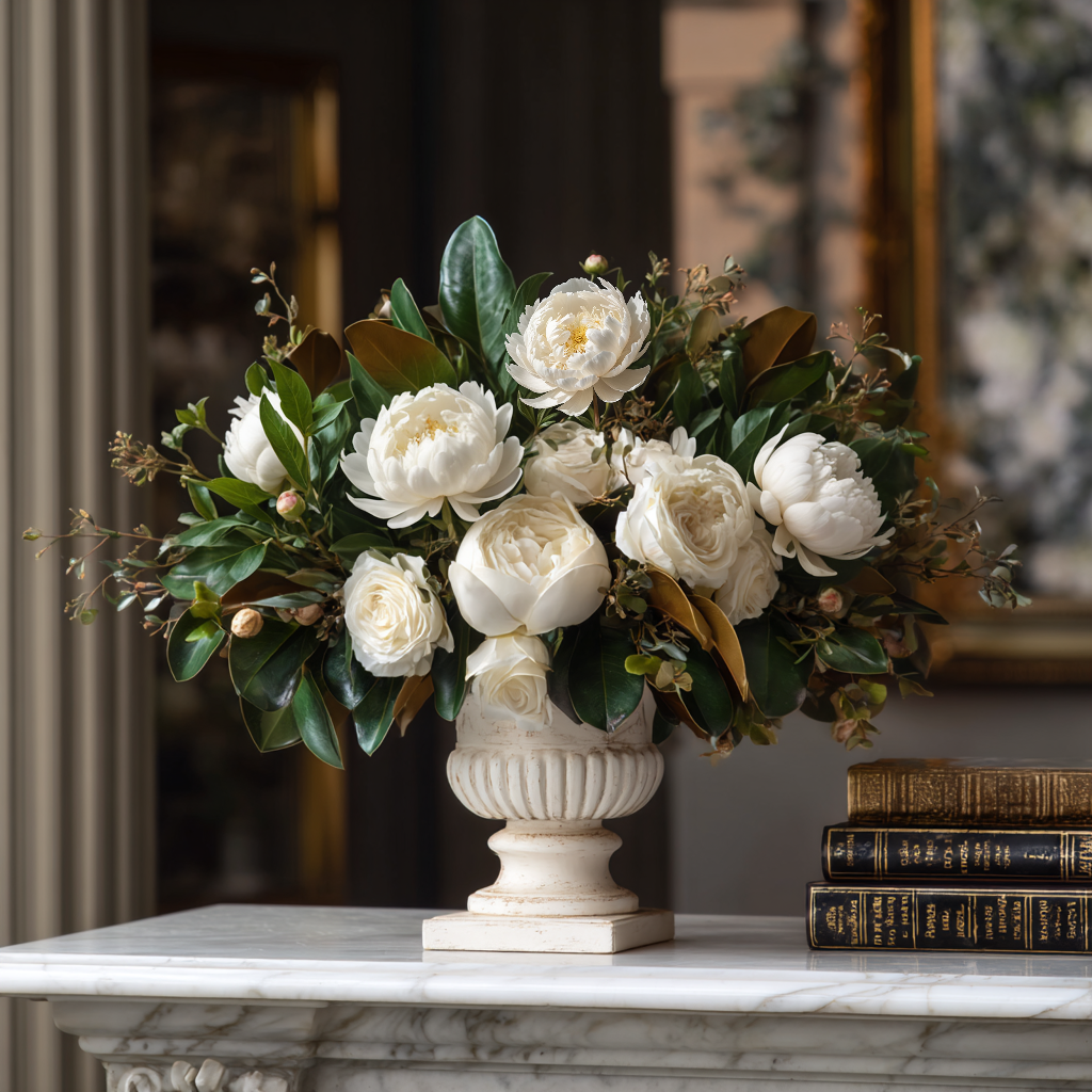 Picture an heirloom urn overflowing with creamy peonies and garden roses, framed by glossy magnolia leaves and winter buds. This peonies arrangement is composed for graceful presence without fuss, a calm focal point for classic interiors or modern spaces craving softness. As part of your xmas floral arrangements plan, it layers ivory petals, deep green foliage, and the caramel glow of magnolia backs for a palette that works with crystal, brass, or rustic wood. Place it on a marble mantel, an entry console, or the center of the dining table, and it reads festive, refined, and welcoming from every angle.