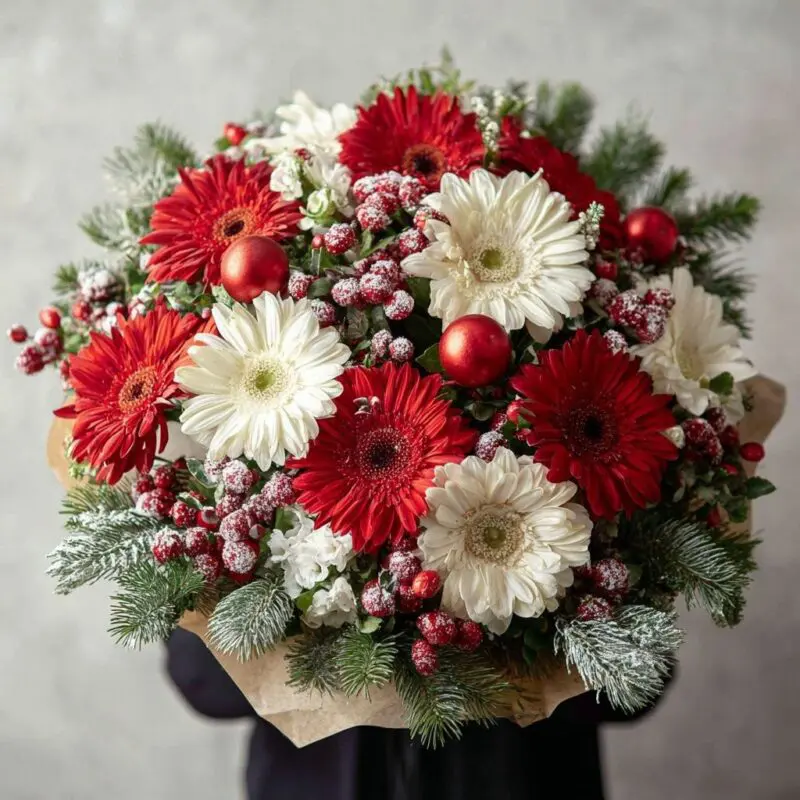 To style the bouquet, start with the tallest evergreens as a supportive backdrop, then nestle the red gerberas slightly deeper for depth and place the white blooms higher for lift. Tuck berries where you want little bursts of sparkle, letting the round ornaments reflect candlelight. This approach creates a lively rhythm that reads festive from every angle. If you prefer a looser look, separate the stems into smaller vessels and scatter them around your mantel, coffee table, or guest bath for a house-wide moment of joy. However you display it, the arrangement maintains the clean graphic appeal people love about christmas arrangements flowers.