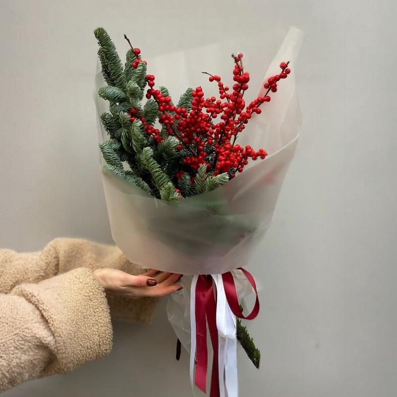 A modern take on xmas flower arrangements, this evergreen and red-berry wrap brings crisp fragrance and cheerful holiday color.