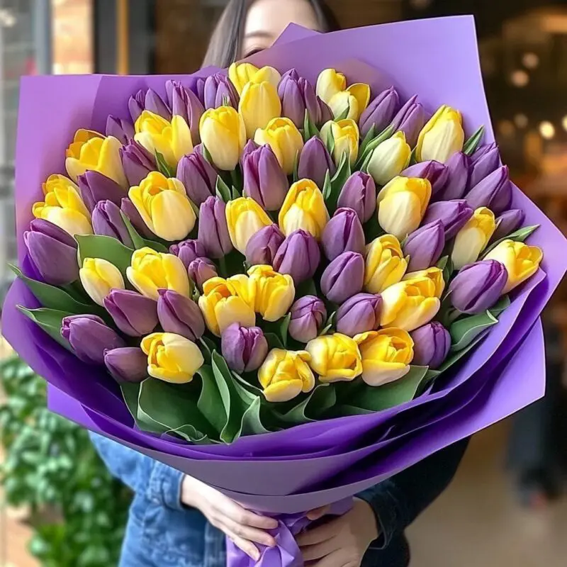 This stunning yellow and purple tulips bouquet exudes elegance and sophistication. The gentle pastel tones create a sense of grace and serenity, perfect for expressing heartfelt emotions.